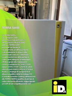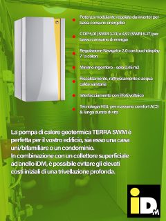 La nuova TERRA SWM è una pompa di calore geotermica modulante per un adeguamento efficiente della potenza. La nuova TERRA SWM provvede con facilità al riscaldamento, al raffrescamento e alla produzione di acqua calda sanitaria per case uni- e bifamiliari. La potenza termica della pompa di calore viene adeguata al fabbisogno effettivo grazie alla modulazione continua compresa tra 3 kW e 13 kW oppure 6 kW e 17 kW. La fonte di calore utilizzata può essere il terreno o l‘acqua freatica. L‘impiego di componenti di altissima qualità e della tecnologia CIC (Controlled Inverter Cooling) attribuiscono alla TERRA SWM la qualifica di pompa di calore altamente efficiente, raggiungendo un COP di 5,01 o rispettivamente 4,97